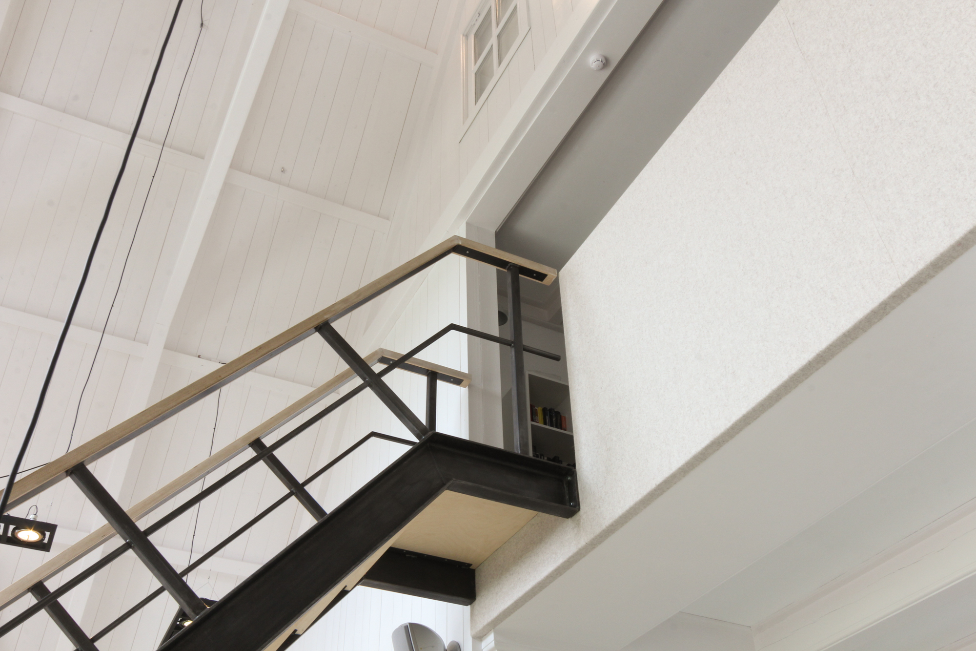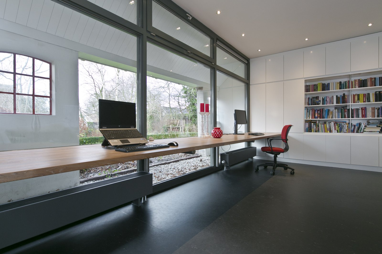 In de bestaande gevel is een sparing gemaakt met daar achter een nieuwe lichtpui. Ook het interieur is door MEERBOUW vervaardigd, zoals de kastenwand en een extra breed bureaublad.