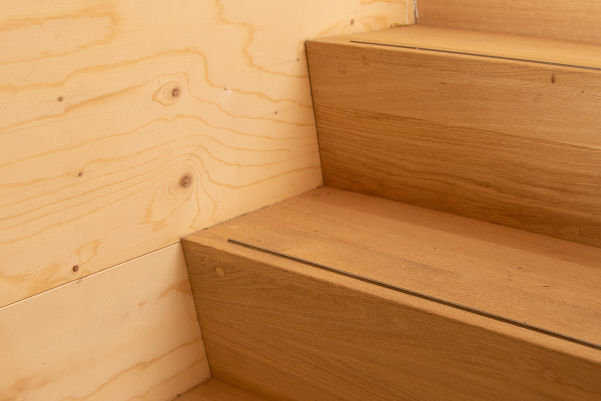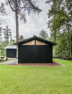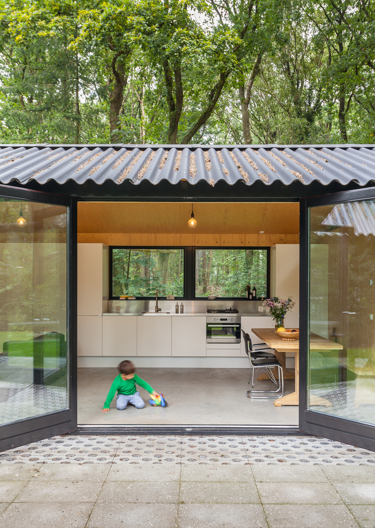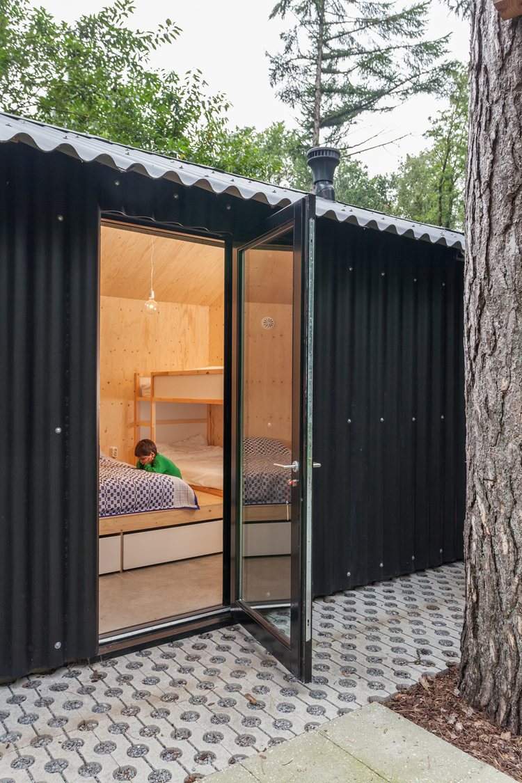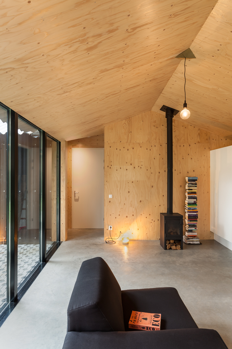 Vakantiewoning van eenvoudige materialen o.a. een gevlinderde betonvloer, houtskelet bouwwanden en het dak aan de binnenzijde bekleed met Fins vuren als zichtwerk en aan de buitenzijde bekleed met golfplaten.
