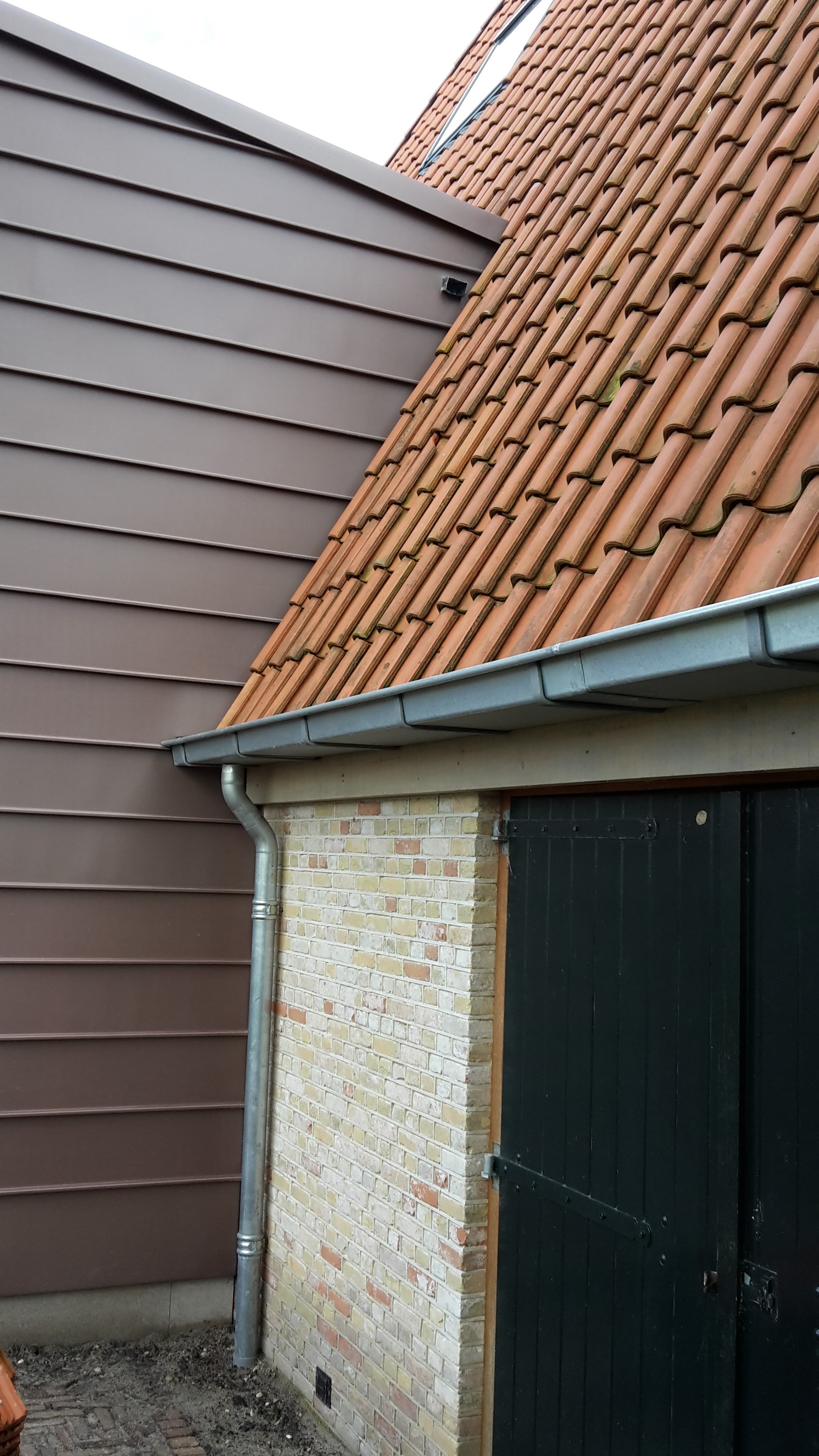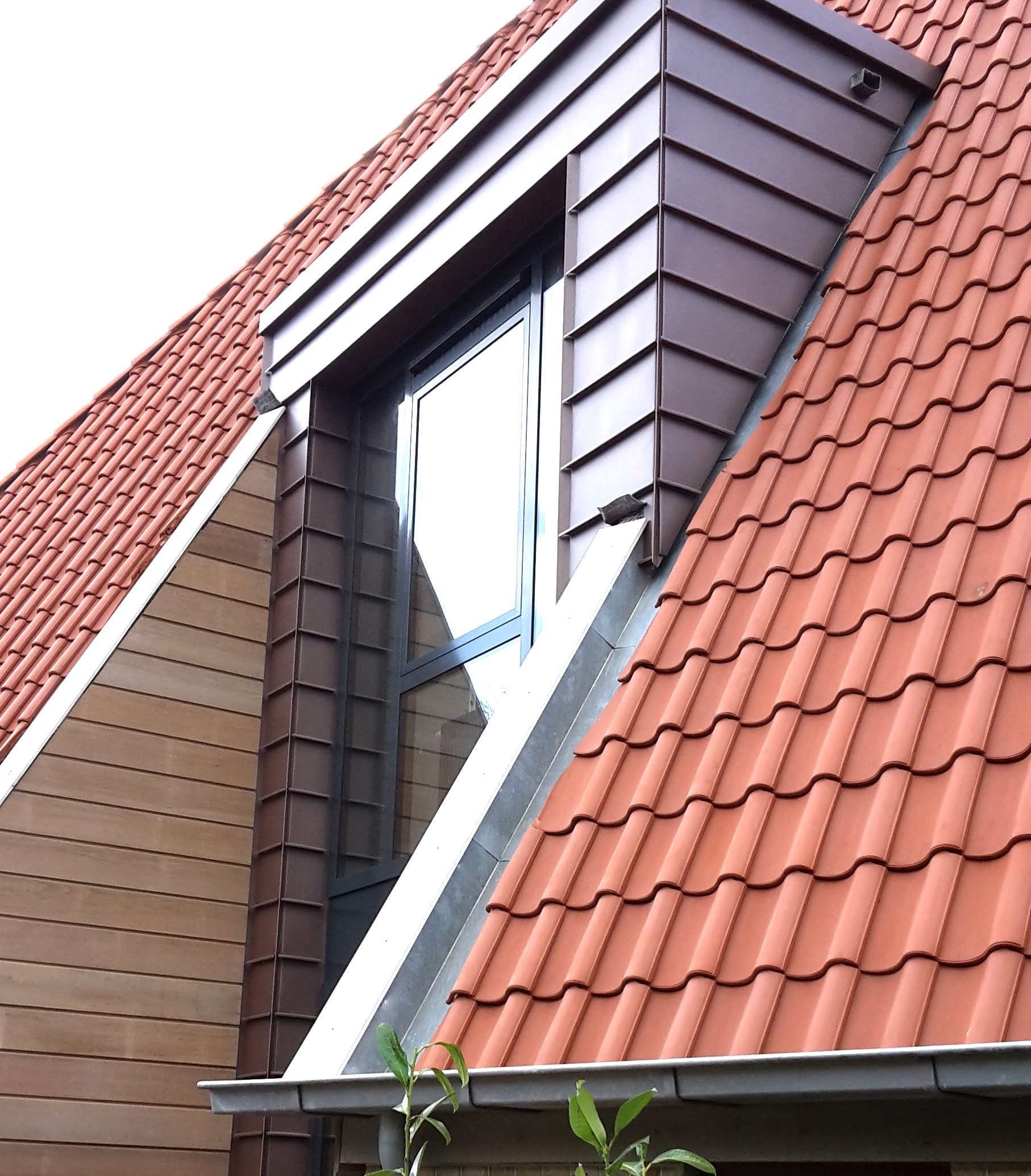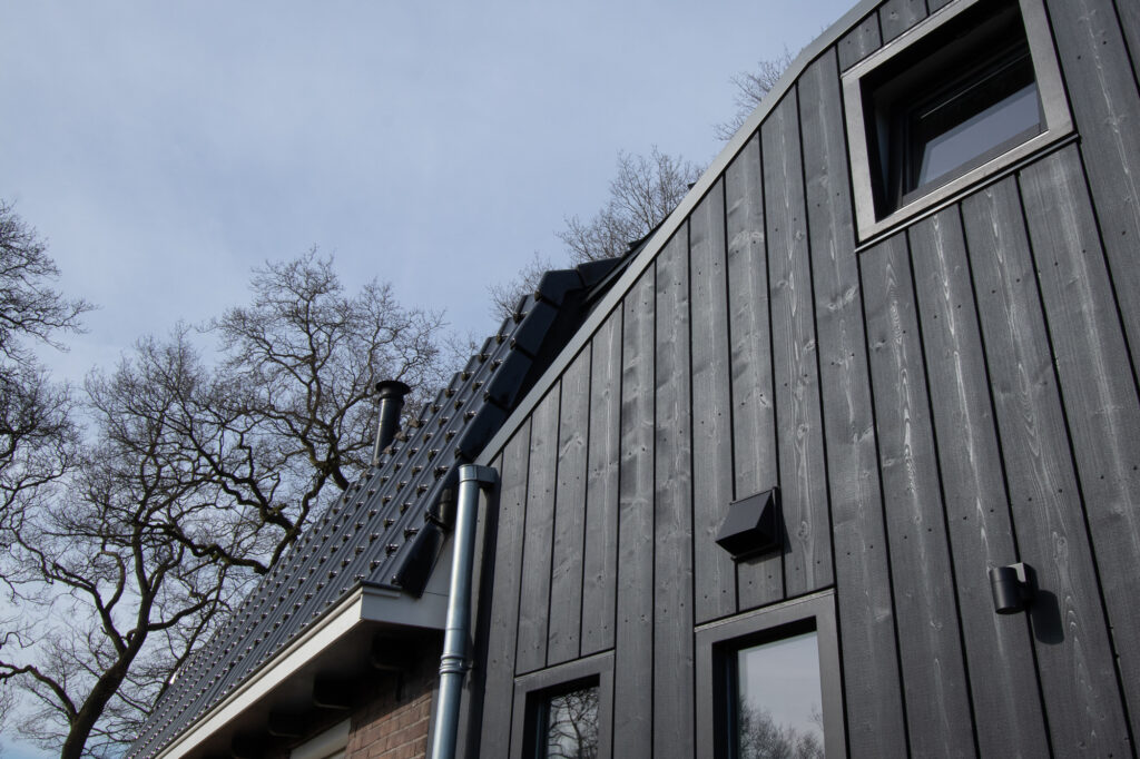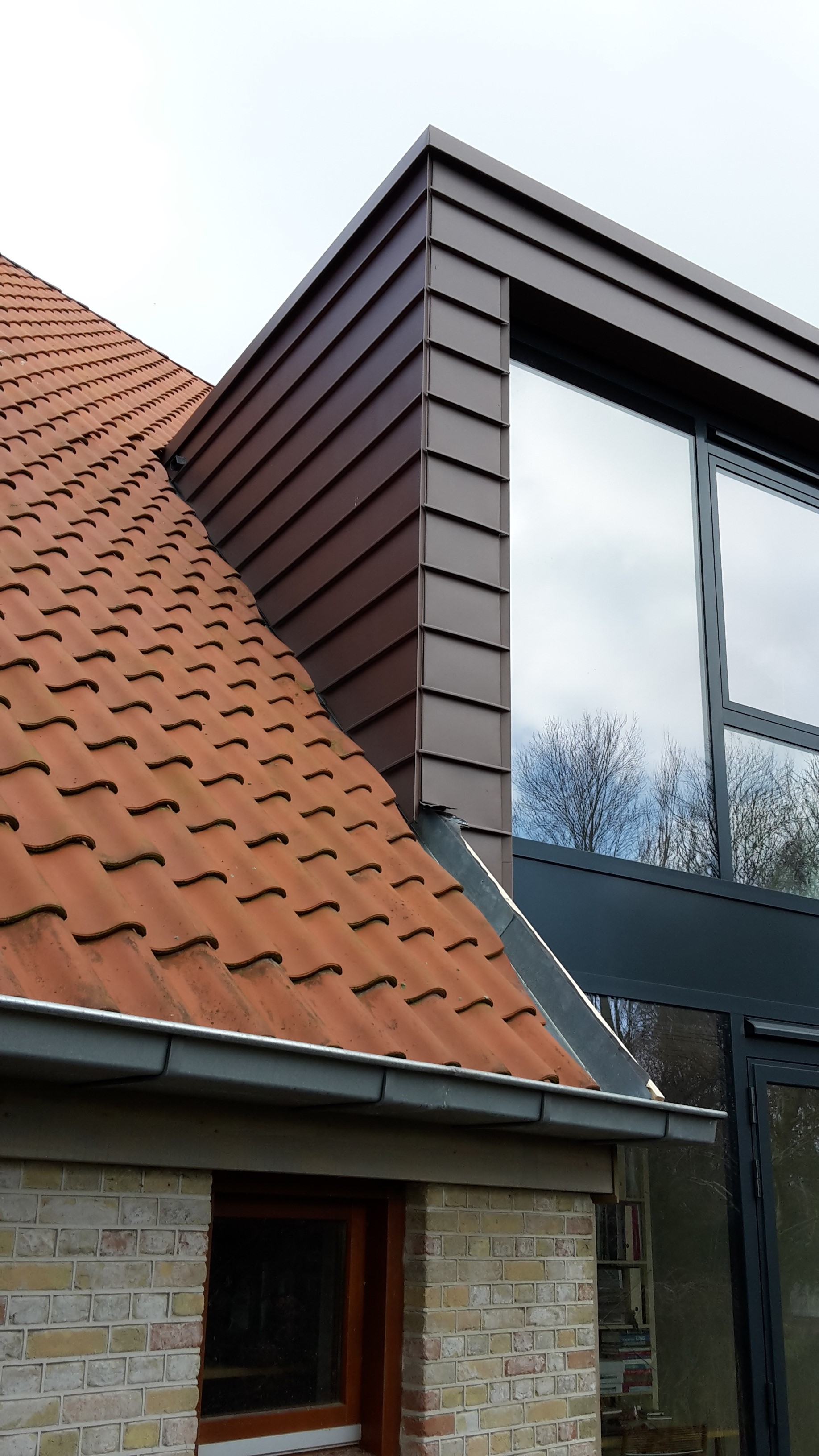 Meerbouw heeft samen met de klant toch wel uitdagende details uitgewerkt en gerealiseerd. De gevels zijn bekleed met modiwood colour fins rabat XL. Het hellend dak is bekleed met Klik Zink.