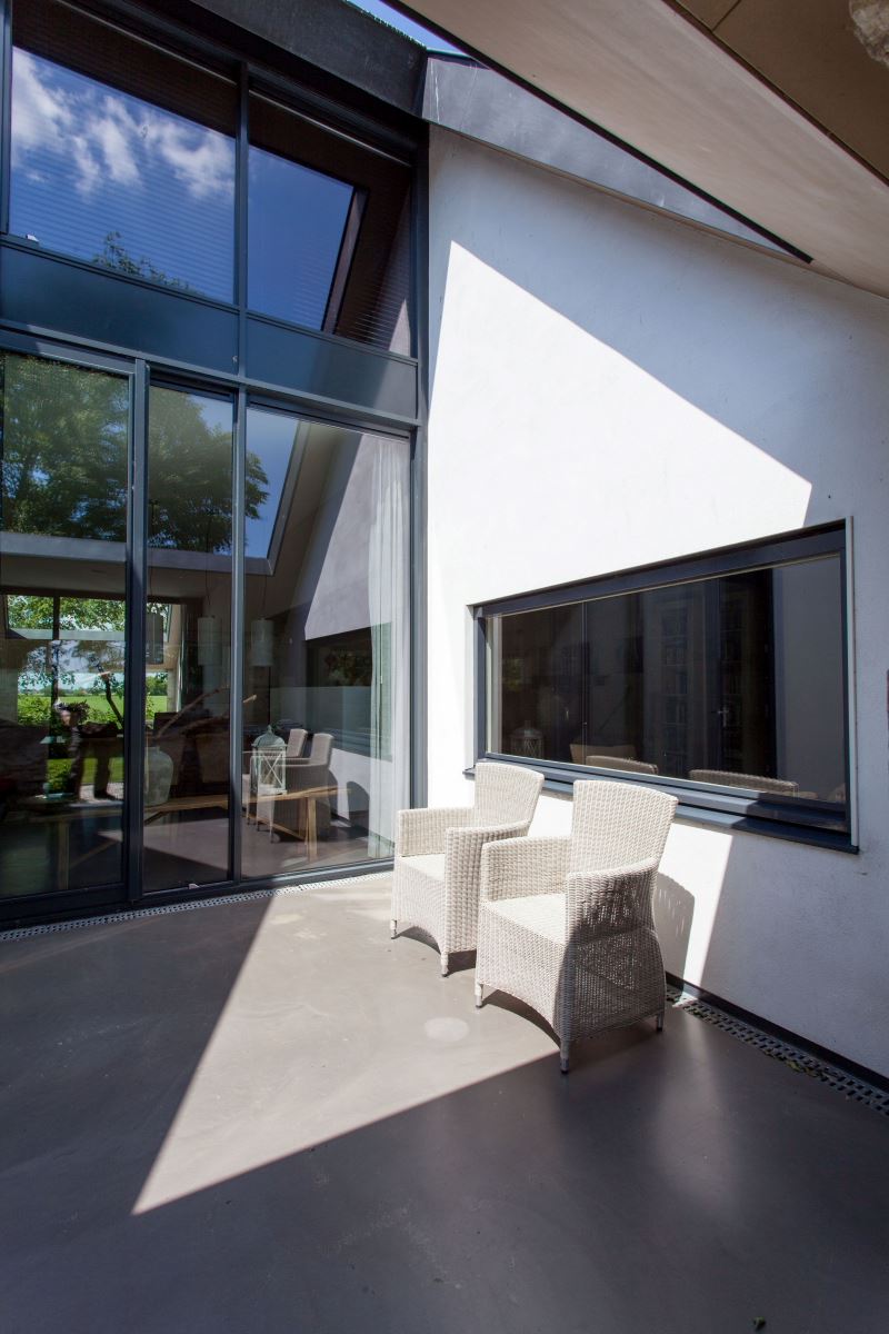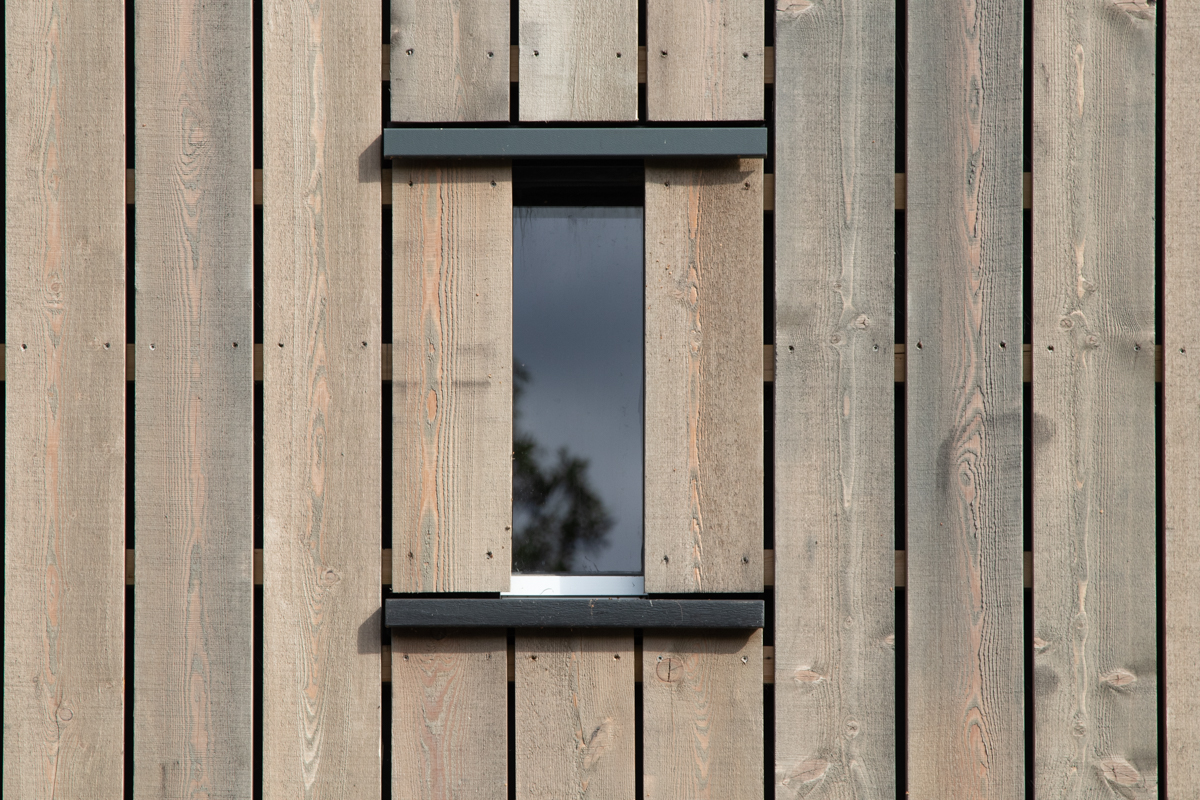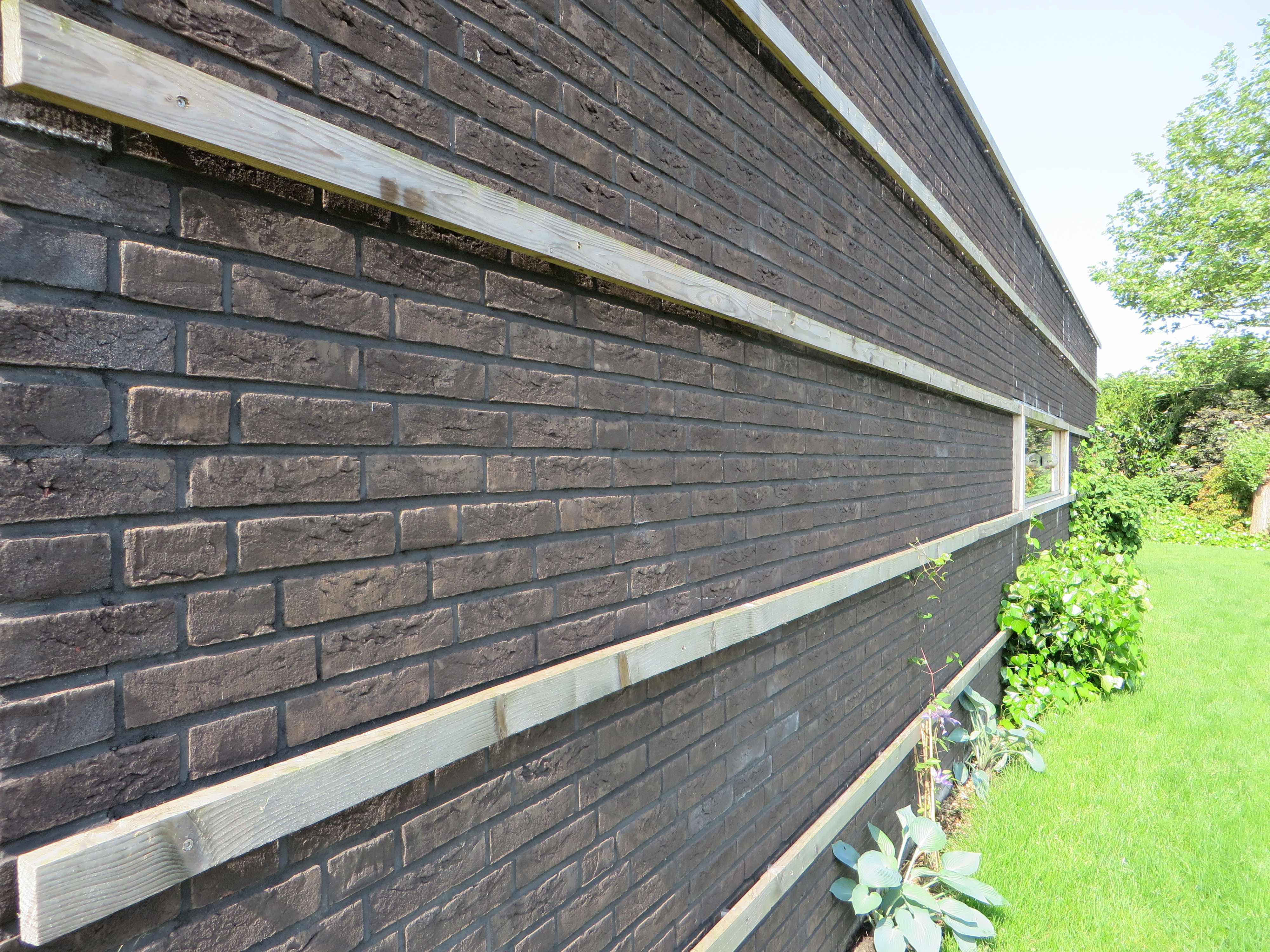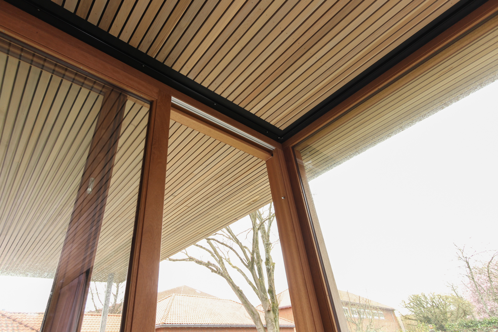 Meerbouw heeft samen met de klant toch wel uitdagende details uitgewerkt en gerealiseerd. De gevels zijn bekleed met modiwood colour fins rabat XL. Het hellend dak is bekleed met Klik Zink.