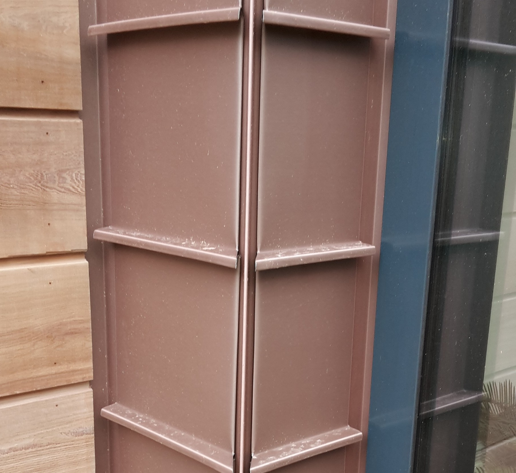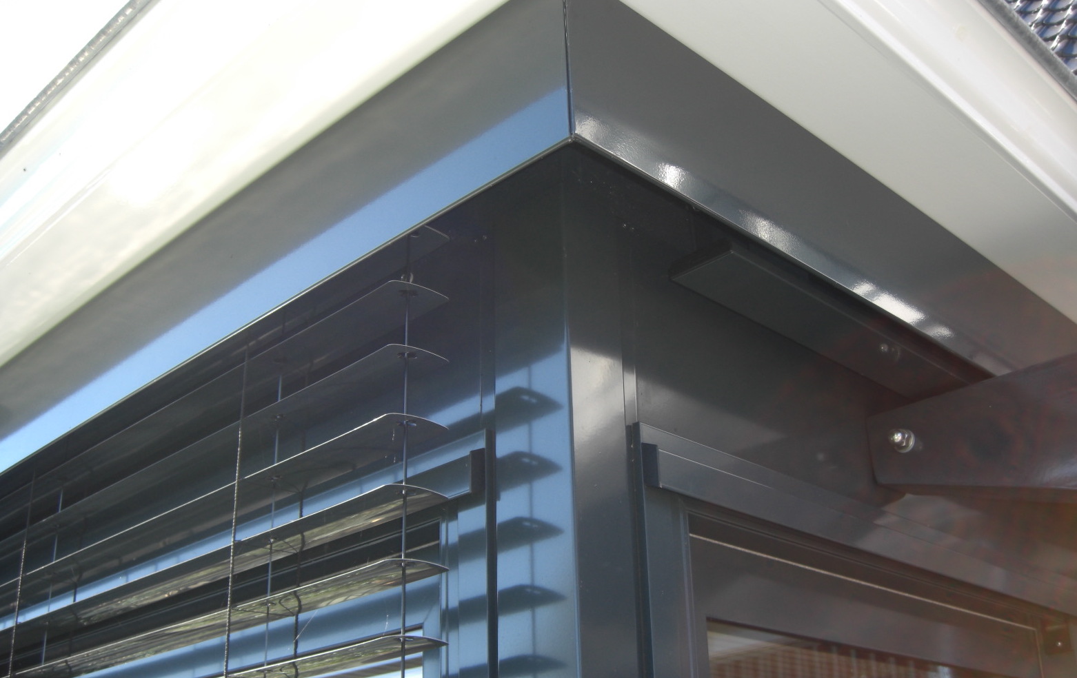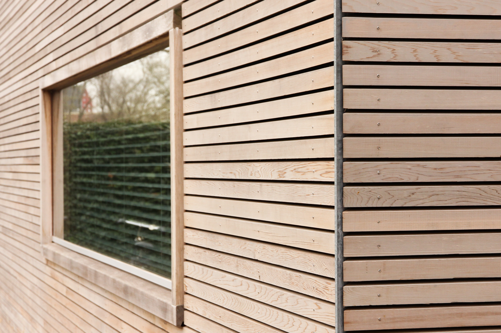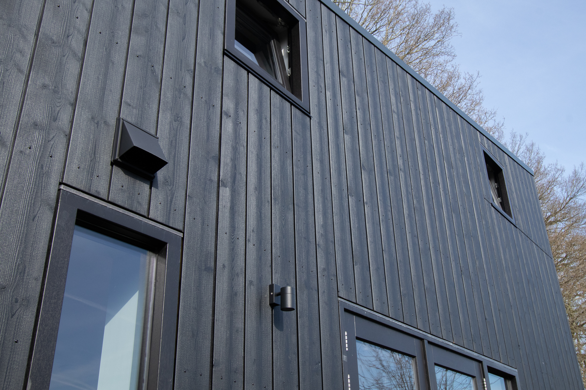 Meerbouw heeft samen met de klant toch wel uitdagende details uitgewerkt en gerealiseerd. De gevels zijn bekleed met modiwood colour fins rabat XL. Het hellend dak is bekleed met Klik Zink.