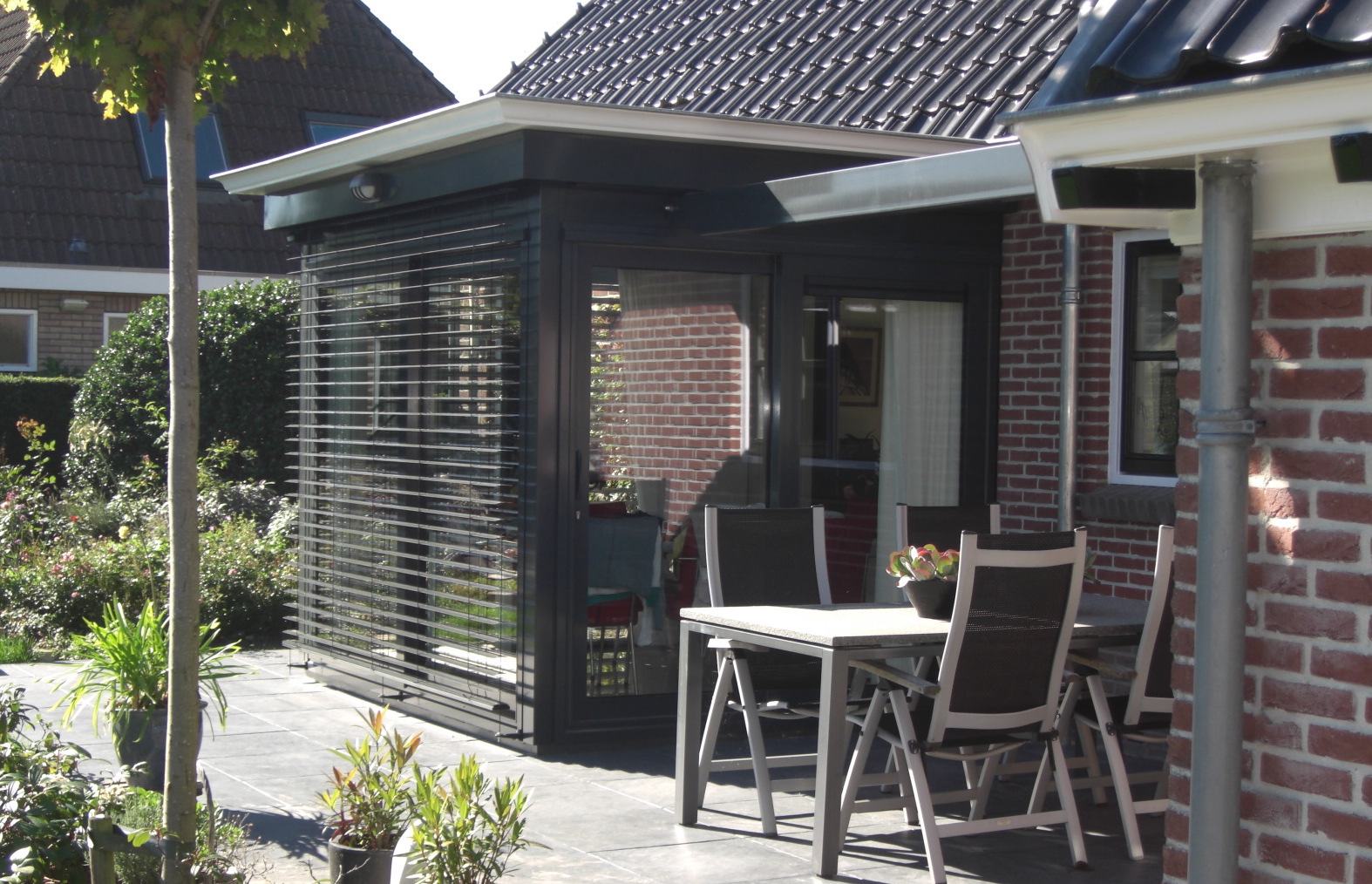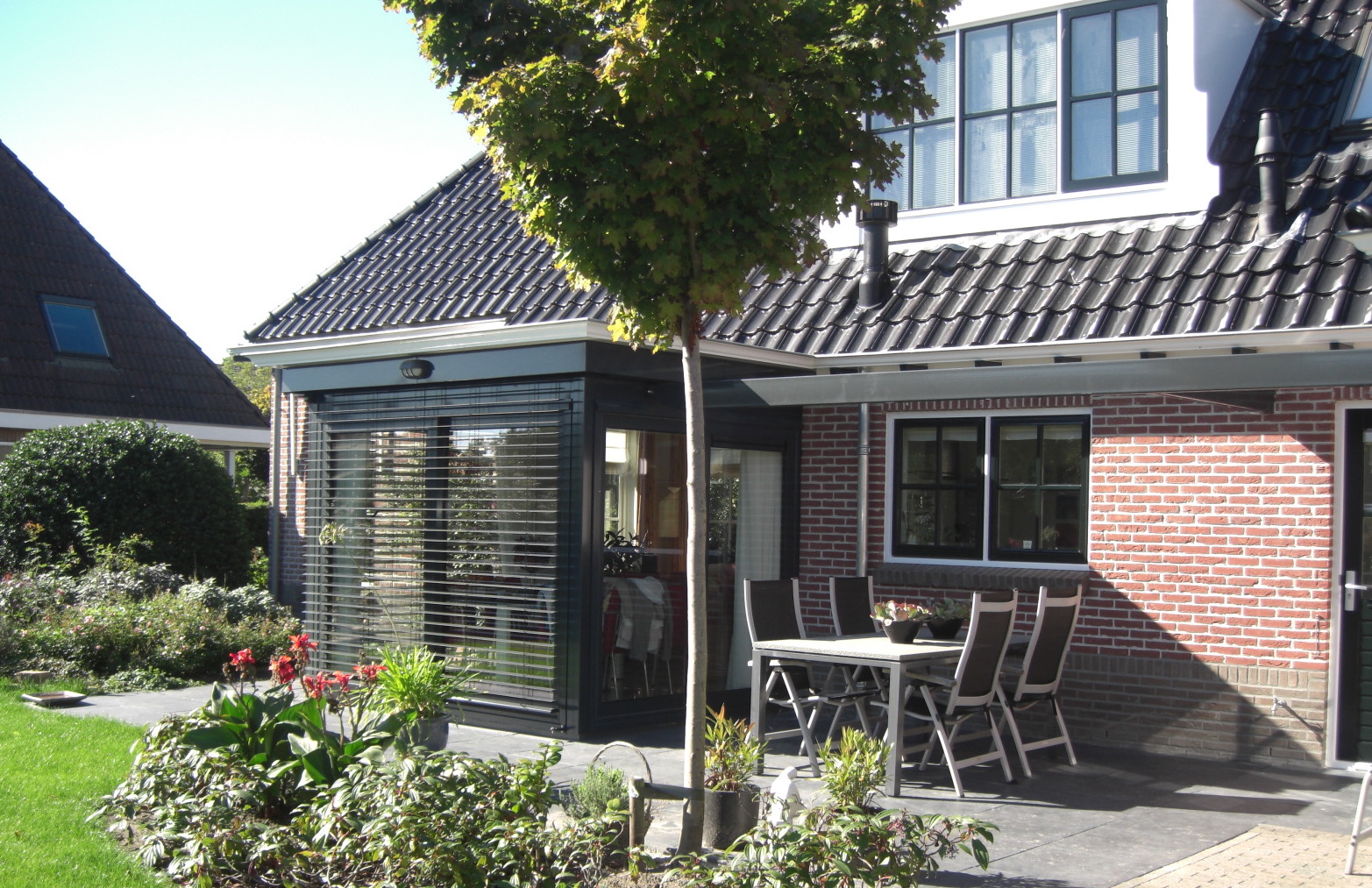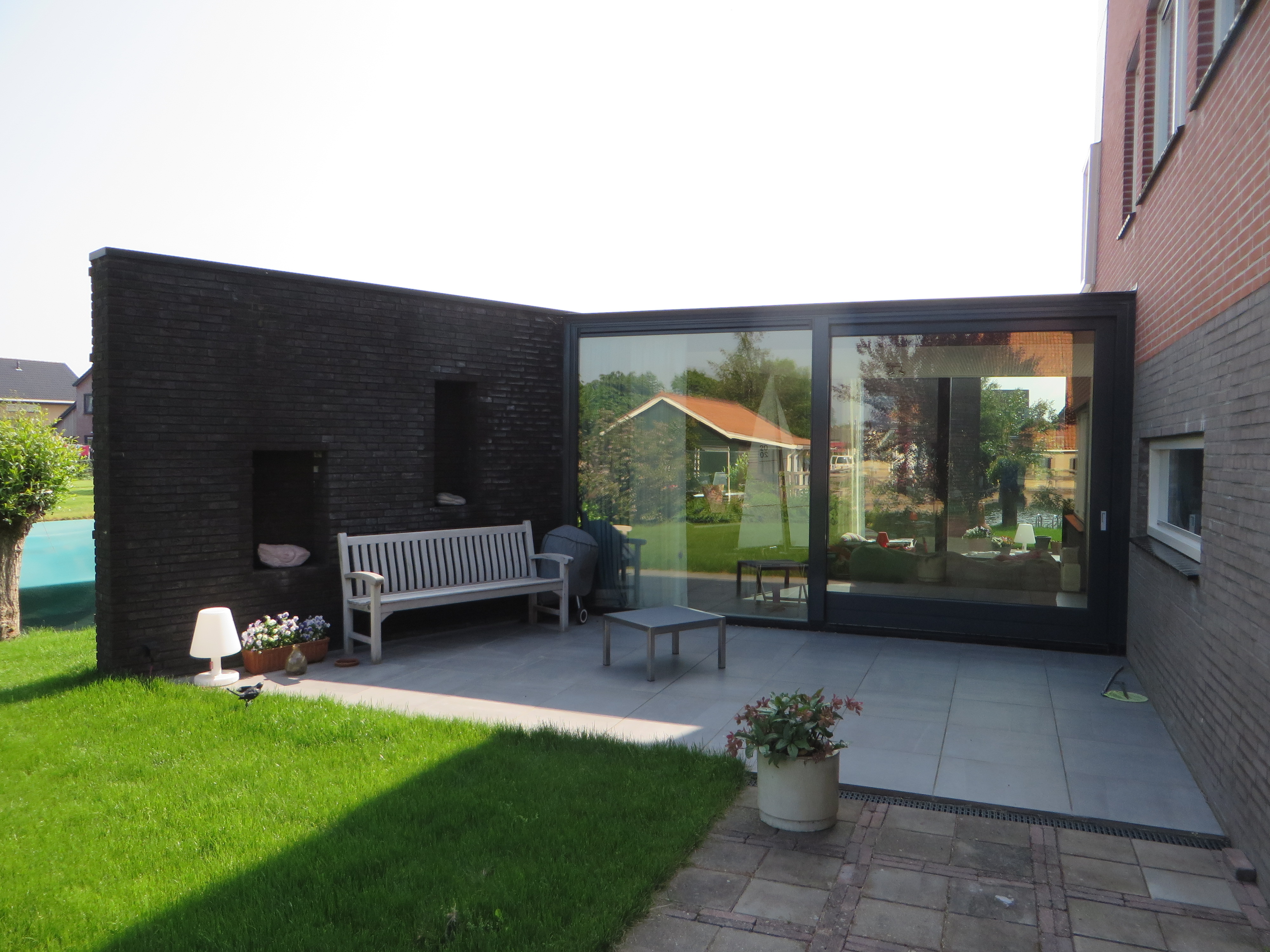 Realisatie aanbouw met een serre van hoogwaardige materialen, de afwerking is met duurzame aluminium kozijnen en aan de buitenkant is een eigenwijze en eigentijdse zonwering geplaatst. Getekend door J.O.N.G. Architecten uitgevoerd door MEERBOUW.