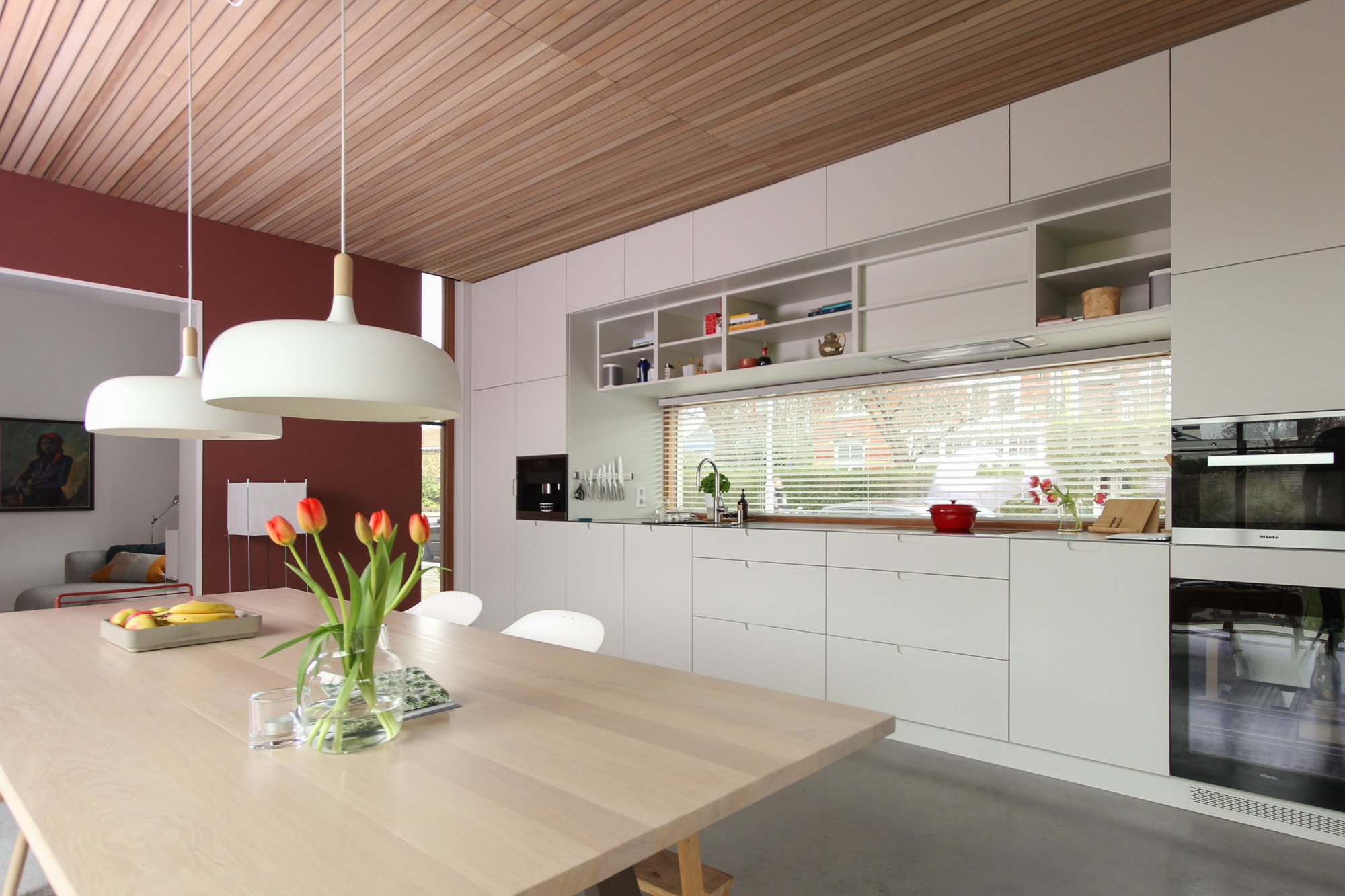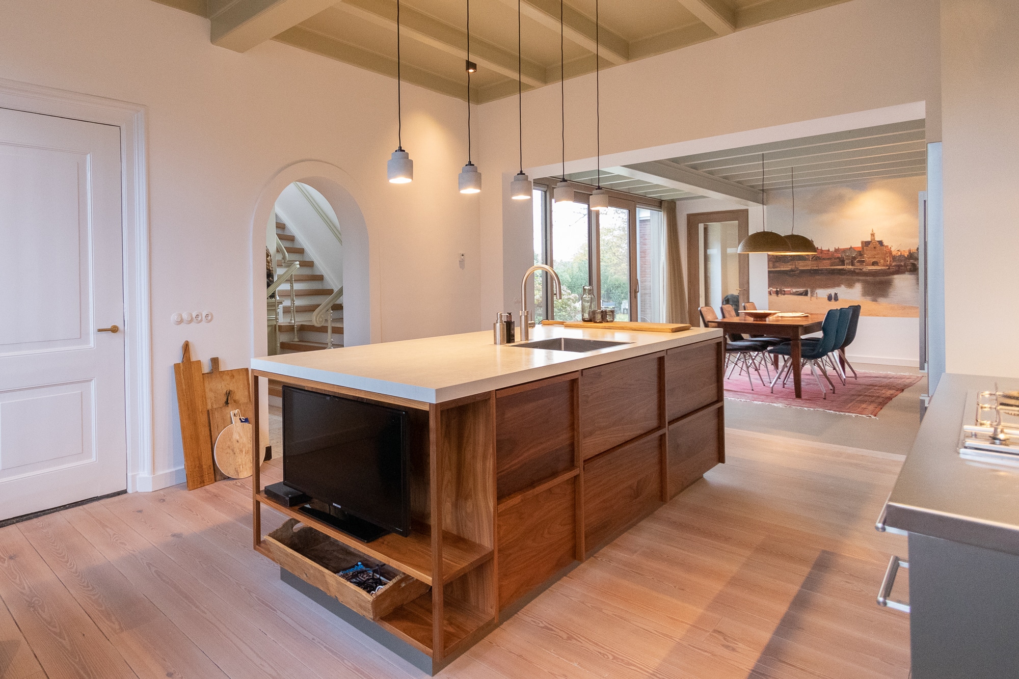 De grootste wens van de huidige bewoners van het pand was: meer ruimte voor licht in het leefgedeelte en het uitzicht op de aangrenzende tuin herstellen. Een deel van de uitbouw uit de jaren ’70 werd daarvoor gesloopt en voorzien van een grote raampartij. Vanuit de keuken in het voorhuis is een open verbinding ontstaan met de nieuwe eetkamer in de voormalige gemeentekluis.